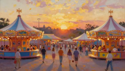 – متحرک کارنیول کے مناظر، جھولے، خیمے اور تہوار کی روشنیوں پر مشتمل روشن تصاویر۔