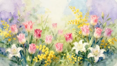 بہار کے اس خوبصورت پھولوں کے گلدستے کے ساتھ موسم کی خوبصورتی کا جشن منائیں۔ شفاف شیشے کے گلدان میں پیونی اور للی کے پھولوں کی یہ واٹر کلر پینٹنگ موسم کی تازگی اور رونق کو ظاہر کرتی ہے۔ ہلکے رنگ اور فنکارانہ انداز ہر پھول کی نزاکت کو نمایاں کرتے ہیں۔ کسی بھی کمرے کو روشن کرنے کے لیے ایک بہترین انتخاب! 💐💖