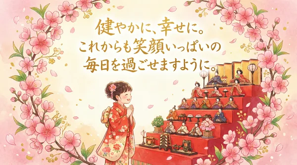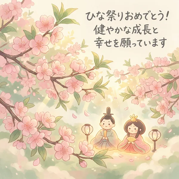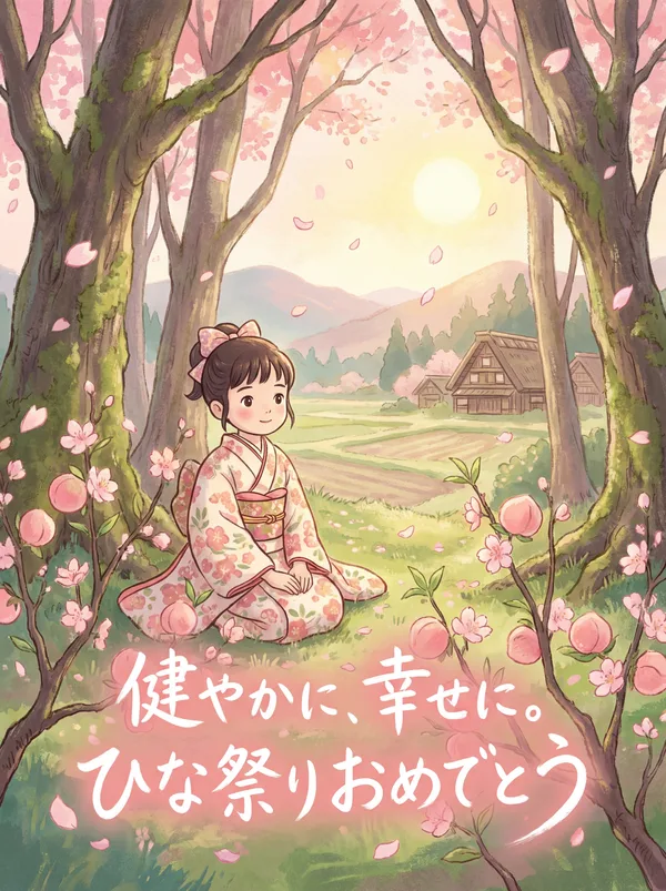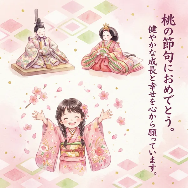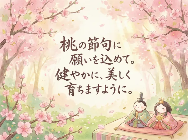 桃の花咲く 春の日に 健やかな成長 願いを込めて 雛人形が 見守る中で 笑顔あふれる 幸せな日々を